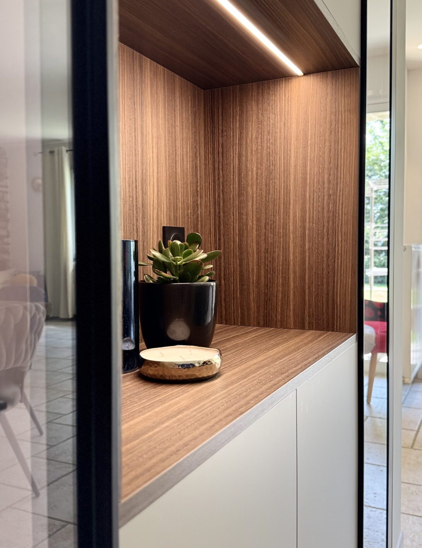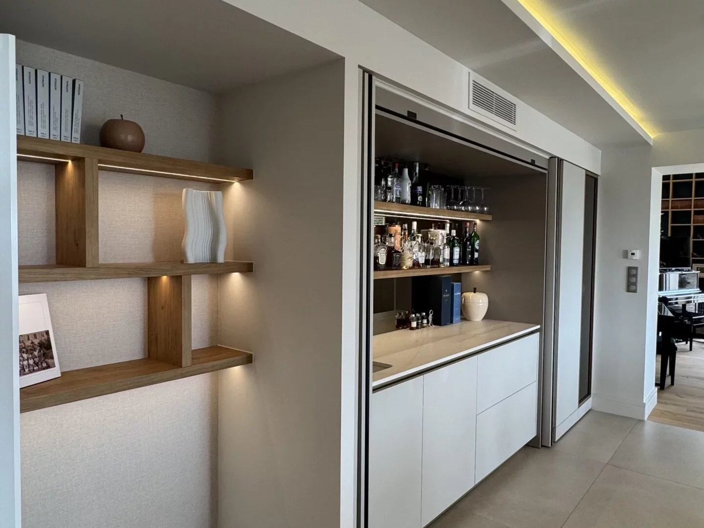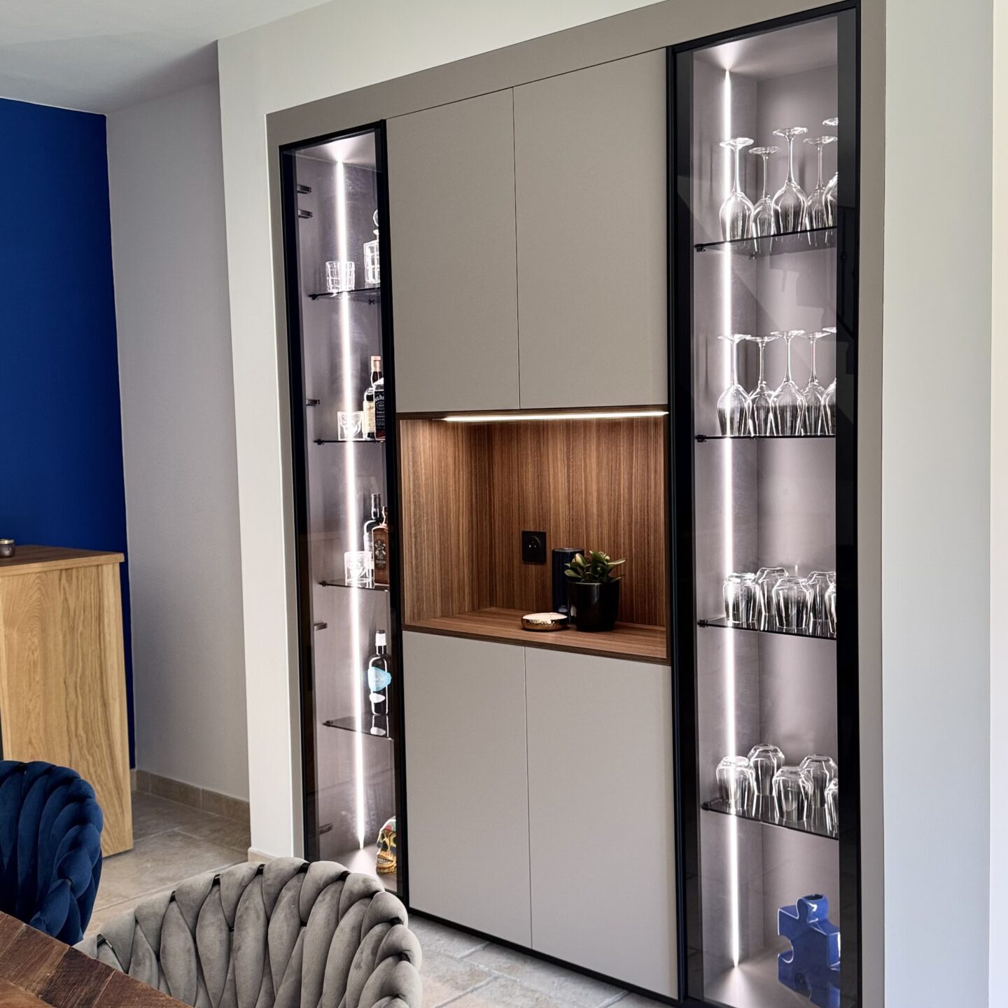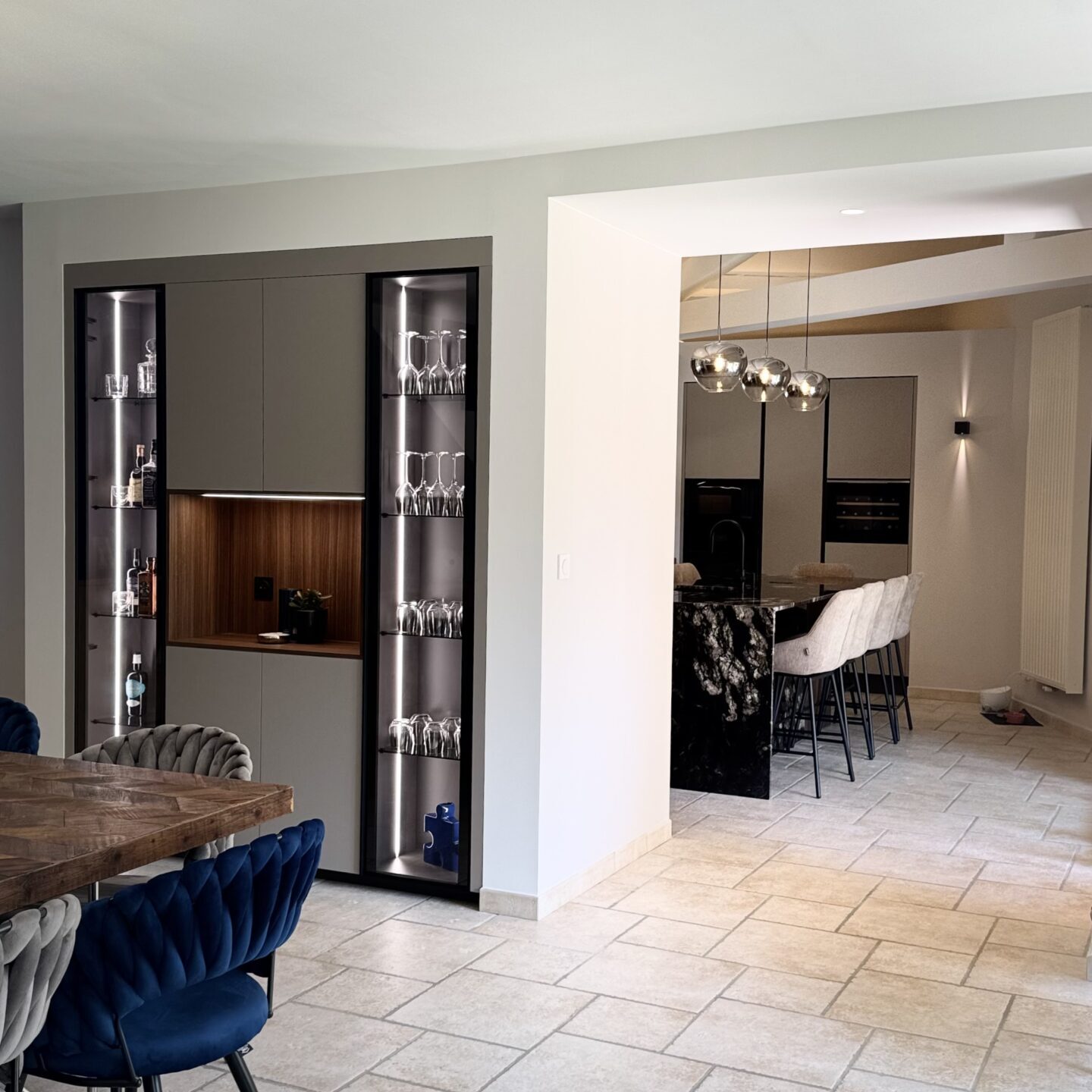 Bar design prolongeant la cuisine avec élégance, tout en s’intégrant parfaitement dans l’espace de vie :