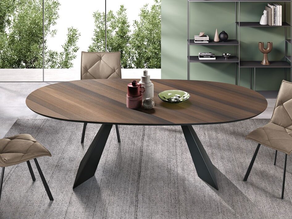 Table extensible avec deux rallonges latérales de 30 cm ; base en métal peint et plateau en grès cérame effet marbre.