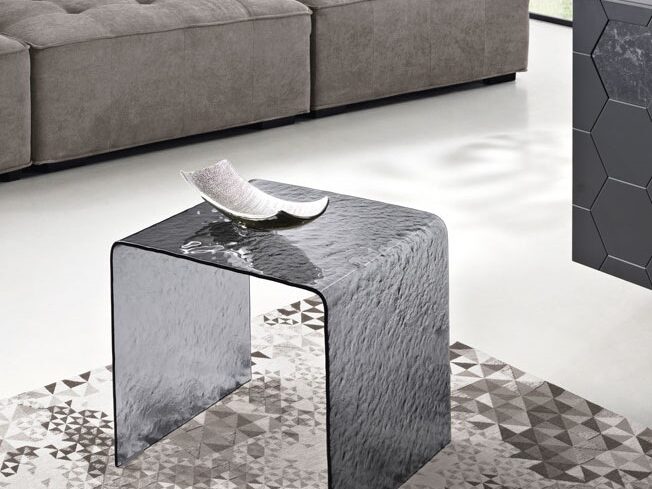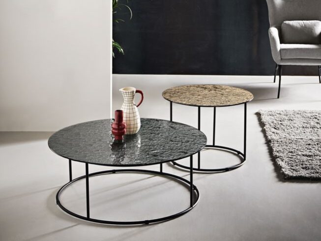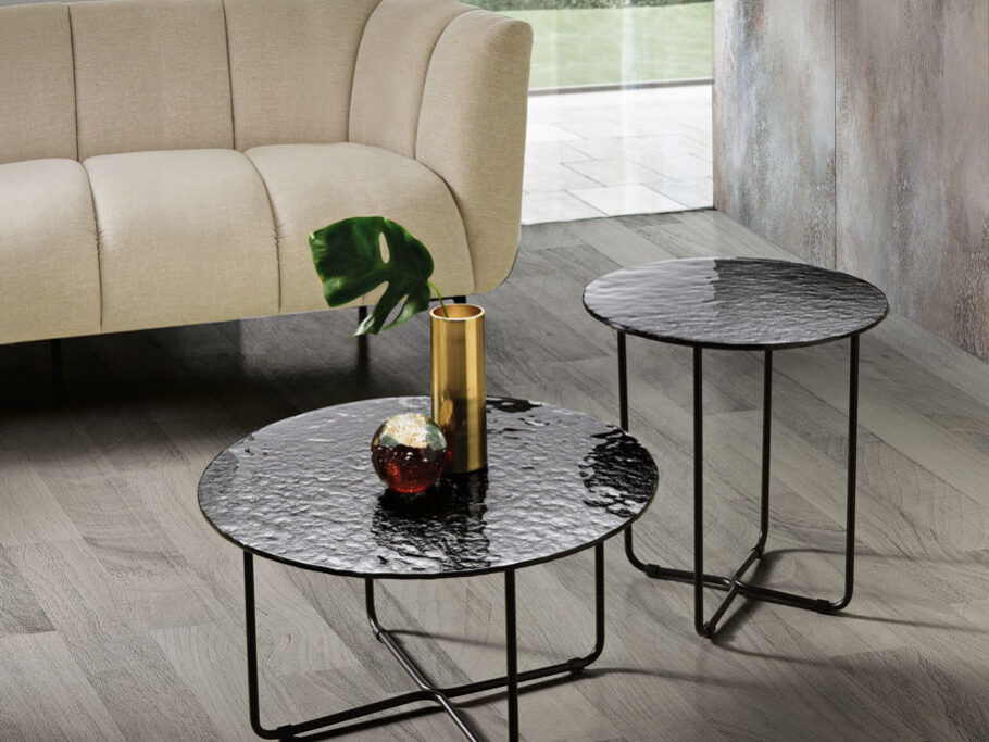 Table basse avec structure et plateau en métal peint en deux versions : verre miroir ou verre martelé peint.